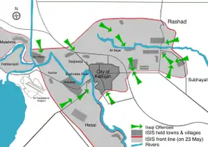 Иракская армия опубликовала заявление 22 мая 2016 года где попросила жителей города и пригородов покинуть этот район по охраняемым маршрутам. Иракская армия также заявила, что местные жители, которые не могут двигаться, должны поднять белые флаги на своих крышах.[21]