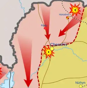 2 марта городской глава В. А. Атрошенко заявил, что наступление на город Чернигов ведётся по трём направлениям «Михайло-Коцюбинское, Халявин — ЗАЗ, Толстолес — Эпицентр»[23]. 2 марта в результате авиаудара пострадала Черниговская центральная районная больница (улица Шевченко, дом № 114), административные учреждения (дома №№ 116А и 118)[24].