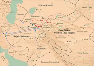 В 1137 году под Ходжентом Елюй Даши разгромил войска самаркандского правителя Рукн ад-Дина Махмуд-хана, который обратился за поддержкой к султану Санджару. Дальнейшие события Ибн аль-Асир излагает так. Санджар, восприняв это как угрозу исламскому миру со стороны «неверных тюрок», собрал большую армию, только смотр которой занял шесть месяцев, и выступил в поход. Махмуд-хан «пожаловался ему на тюрков-карлуков», и Санджар напал на них. Те прибегли к защите Елюя Даши, написавшему сельджукскому султану «письмо, которое заключало ходатайство за тюрков-карлуков и требовало простить их». Но Санджар не принял ходатайства, а ответил угрожающим посланием, требуя принять ислам, после чего гурхан стал готовиться к войне. «При нём были тюркские, китайские[4], хитайские и другие войска». Садр ад-Дин ал-Хусайни уточняет, что карлуков спровоцировали враждебными действиями эмиры Санджара, а султан отверг их примирительный жест — передачу в дар большого количества скота. В итоге у карлуков не осталось иного выхода, кроме как просить заступничества гурхана и подстрекать его к войне против Сельджукского государства.