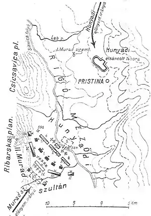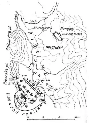 Венгерская армия прошла через Крушевац, Янкову Клисуру (которая носит это имя c того времени) и Топлицы. Когда 17 октября Хуньяди пришел на Косово поле — место первой битвы за Косово в 1389 году между сербами и османами — османская армия была уже там[6]. Как писал венгерский историк Палошфалви, невозможно рассчитать точно размер армии Хуньяди. Однако, по его мнению, это была самая большая армия, которую Хуньяди когда-либо собирал против османов[20]. Перед началом битвы Мурад отправил Хуньяди посланника с предложением о мире, но Хуньяди отказался, и посланник вернулся к султану ни с чем[19].