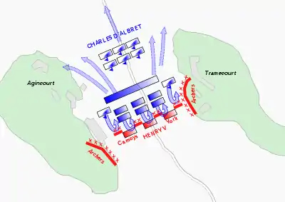 Воины центра располагались в линию 4 человека глубиной и 150—200 солдат шириной. На флангах были поставлены английские и валлийские лучники, укрепившие свои позиции рядами деревянных кольев, врытых в землю под острым углом к противнику. Эта тактика, новая для англичан, возможно, появилась под влиянием успехов турок под Никополем (1396), где османские лучники использовали деревянные колья для обороны от бургундской конницы[8]. Построение англичан было удачным: узкое пространство сковывало действия французской конницы, в то время как глубокая грязь недавно вспаханного поля сильно затрудняла её маневренность.