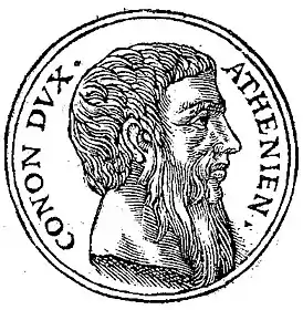 Конон, находившийся на Андросе, был отправлен с 20 кораблями к флоту на Самос. Алкивиад передал ему командование и, опасаясь гнева народа, решил отправиться в изгнание на Херсонес Фракийский[12]. Положение афинского флота ввиду недостатка средств и активных действий спартанцев было тяжёлым. Конон смог укомплектовать только семьдесят кораблей из ста[13][14] и стал ожидать прибытия подкреплений от союзников[15].