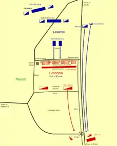 Тома де Фуа-Лескён со своими 400 кавалеристами тем временем достиг мостика через канаву, пробился через него и направился к имперскому лагерю с юга. Чтобы остановить французов, Колонна отправил кавалерию под командованием Антонио де Лейва, а Сфорца направился со своими войсками по дороге к мостику, намереваясь окружить французов. Однако французам удалось пробиться обратно и соединиться с основной частью армии.
