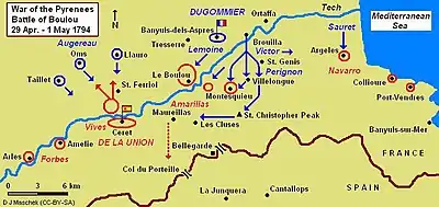 Весной 1794 года испанская армия удерживала часть французской территории к югу от реки Тек и к северу от Пиренеев. Испанское правое крыло на побережье Средиземного моря было отделено от центра и левого крыла гористой местностью. Сначала Дюгомье провёл успешную ложную атаку своим правым крылом, которая отвлекла испанские войска от французского центра. Затем он направил основную часть своих сил между испанским центром и правым флангом. Они обошли испанский центр и заставили своих противников отступать через труднопроходимый горный перевал. Испанцы понесли тяжёлые потери и бросили обозы и всю свою артиллерию.