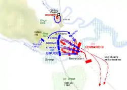 Тем временем английские войска продолжали наступление на Стерлинг. Шотландский король умелыми манёврами перерезал все прямые пути на город, однако Эдуард II избрал наиболее неудачный и опасный маршрут, пролегавший через местечко Бэннокбёрн. Вечером английский король отдал приказ о передислокации войск на равнину между реками Бэннокбёрн и Форт. В результате англичане оказались на крайне ограниченном, заболоченном участке. Вскоре после наступления рассвета утром следующего дня шотландские копьеносцы, объединённые в три баталии, начали наступление на английские позиции. Эдуард был немало удивлён появлением из леса шотландской армии. Тем временем воины Роберта I Брюса, приблизившись к английским позициям, опустились на колени для молитвы. Удивлённый английский король, по преданию, сказал, что они просят о милосердии, однако один из его приближённых намекнул, что шотландцы просят милости у Бога, но никак не у английского короля.
