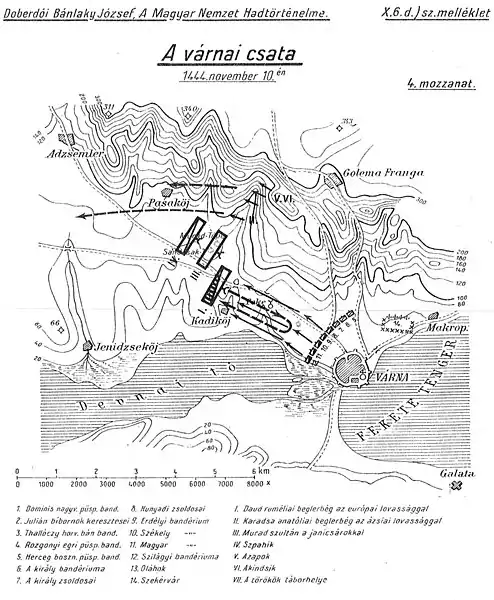 Согласно Халкокондилу, в окружении короля люди, завидовавшие славе Хуньяди, пытались снизить его влияние. Они хотели убедить короля, что советы Хуньяди плохи, и спровоцировали Владислава лично напасть на Мурада[10][50]. Король решил игнорировать советы воеводы и последовал совету дворян. Он подстегнул коня, за ним последовало около 500 его рыцарей[51]. По описанию османского историка Мехмеда Нешри, «король прокричал: „Я хочу поговорить с султаном! Мурад! Трепещи от страха!“ и ринулся на янычаров. Янычары расступились на две части, и король проскакал между ними. Они немедленно зарубили сзади его лошадь и сбили его с ног. Караджа Хызыр нагнулся, чтобы убить его, [король] закричал: „Господин Мурад! Господин Мурад!“. Хызыр проигнорировал его и немедленно отрубил ему голову, прикрепив её к копью»[26][52][53][54][55][k 4].