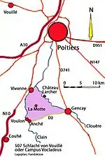 Пройдя через Тур, франкско-бургундское войско прибыло в окрестности Пуатье. Им навстречу из Тулузы выступило вестготское войско. Противники сошлись в битве у местечка, называемого в средневековых источниках Campus Vocladeus. О том, какой из современных населённых пунктов имеется в виду под этим названием, между историками идут дискуссии. Наиболее распространёнными теориями являются предположения о том, что это или селение Вуйе, расположенное в 17 километрах к северо-западу от Пуатье, или селение Шато-Ларше, расположенное к югу от города и в средневековье известное под названием Боглад. В окрестностях второго из них находится ряд мест, которые историки связывают с некоторыми обстоятельствами битвы: несколько топонимов, в которых упоминается лань, чудесным образом показавшая франкам место брода через Вьенну, и массовое захоронение воинов, возможно, погибших во время битвы[11].