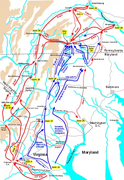Северовирджинская армия вошла в долину Шенандоа и ликвидировала федеральный гарнизон в Винчестере (Второе сражение при Винчестере). 15 июня корпус Юэлла перешёл реку Потомак у Уильямспорта, а 24—25 переправились корпуса Лонгстрита и Хилла. Южане вошли в Пенсильванию. Потомакская армия также двигалась на север, прикрывая направление на Вашингтон, и перешла реку Потомак 25—27 июня.