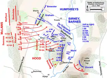 Вскоре появился Лонгстрит. Очевидцы называют разное время его появления, однако Дуглас Фриман полагал, что Лонгстрит пришёл в 05:15 или около этого. Дивизии его корпуса подошли позже: Мак-Лоуз около 06:00, Худ около 07:30. Артиллерия корпуса шла последней и прибыла в 09:00[15]. По поводу задержки Лонгстрита Фриман пишет: «Эта задержка I корпуса сорвала все планы генерала Ли. На рассвете 2 июля федералы имели на позиции только I, XI и XII корпуса, и почти все они защищали Кладбищенский холм и Калпс-Хилл. II корпус начал прибывать в 07:00, III корпус прибыл примерно в то же время и начал занимать позицию на Кладбищенском хребте, а V корпус прибыл около 08:00. До 07:00 федералы имели примерно 20 000 боеспособных солдат, но к 09:00 их число достигло 58 000»[15].