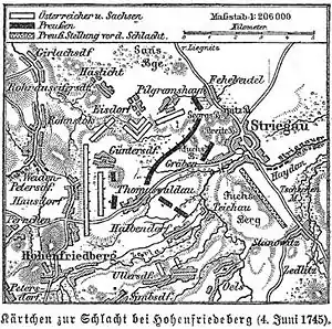 Карл Лотарингский, узнав о поражении саксонцев, остановился и занял позицию, на которой немедленно был атакован наличествующими прусскими войсками. Освободившемуся после поражения саксонцев правому крылу Фридрих приказал переменить фронт так, чтобы действовать во фланг и тыл австрийцев. Карл Лотарингский, отбивая удары, не воспользовался задержкой прусских главных сил при переправе через ручей для своевременного отступления.