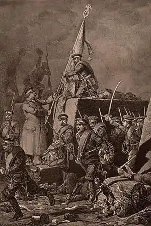 ![]() Бой под Горным Дубняком 12 октября 1877 года. Водружение знамени 4-го батальона лейб-гвардии Павловского полка на редут | |||