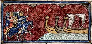 ![]() Филипп II Август в ожидании своего флота, миниатюра Махиета XIV века, Хроника Сен-Дени | |||