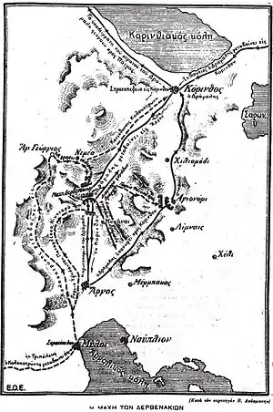 Многие из его офицеров, во главе с Юсуф-пашой из города Патр, советовали ему сделать Коринф своей базой и с помощью морских сил в Коринфском заливе изолировать Пелопоннес, и только после этого идти на Триполицу. Драмали игнорировал эти советы и, полный уверенности в своих силах, решил идти далее, в область Арголиду.