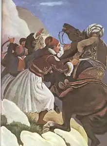 В начале все шло хорошо. Повстанцы взяли батареи на холме Профитис-Илиас, откуда турки расстреливали крепость. Но в 17:30 «нас побили со всех сторон»[8]. Повстанцы отступили в панике, оставив на поле боя 250 человек убитыми.