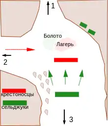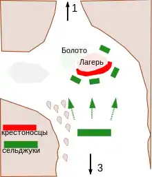 1 июля авангард продолжил движение, но вскоре разведчики донесли о приближении огромной армии противника. Боэмунд приказал расположиться у болота за камышами. Крестоносцы не успели занять позиции, когда с флангов и с тыла напали сельджуки[27].