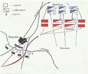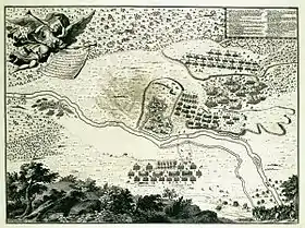 ![]() Вверху:битва при Зинсхайме на гравюре Себастьяна Болье (1698), внизу: схема битвы | |||