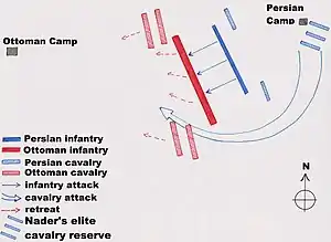 Надир-шах возглавил атаку 40,000 элитных всадников («Всадников Хорасана»), которые до того момента оставались в резерве. Об ожесточенности завязавшегося боя свидетельствует тот факт, что под Надир-шахом пали два коня, и все-таки османская армия не смогла сдержать фланговый кавалерийский удар персов и обратилась в бегство. Контингент турецких анатолийских войск из Малой Азии, (15,000 человек) побежал первым, приведя османскую армию в замешательство. Персидская армия организовала погоню и преследовала противника до сумерек, а затем вернулась в свой лагерь.