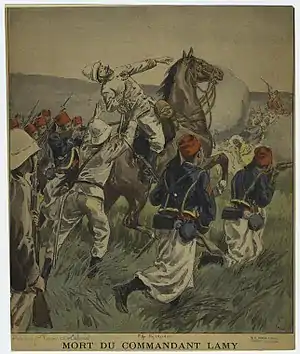 ![]() Заметка во французской газете о смерти майора Лами, окружённого сенегальскими стрелками. | |||