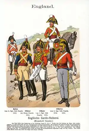 ![]() Британские тяжёлые драгуны носили в Магилье красную куртку и черную двууголку, и выглядели похоже на солдата слева. Шлем был принят только в 1813 году[1]. | |||