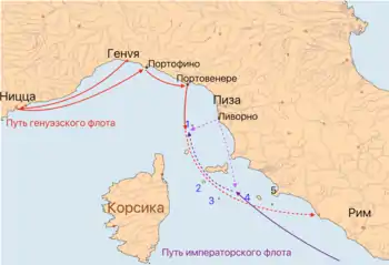Император послал письмо в Пизу с предложением объединить усилия против общего врага. У Фридриха было 27 вооружённых галер под командованием его сына Энцо и адмирала Ансалдо де Мари. Ансалдо был генуэзцем и до февраля находился в Генуе. Он был осведомлён о всех намерениях противника[17]. Этот флот отплыл к Пизе, которая была соперником Генуи и верной императору. Пизанским флотом из 40 галер командовал Уголино Бузаккерини[18].
