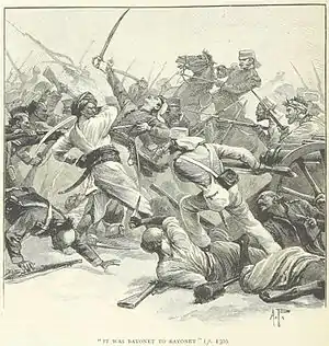 Орудия мятежников прикрывали мост через реку, но войска Николсона перешли реку вброд выше по течению и построились в две линии, британская артиллерия обстреляла караван-сарай. Николсон приказал дать сигнал к наступлению и лично возглавил 61-й пехотный полк и 1-й бенгальский стрелковый полк, они пробежали 180 м по грязи, чтобы штурмовать караван-сарай. На правом фланге британцев 2-й пенджабский пехотный полк (стрелки Грина) атаковали саму деревню Наджафгарх[4].