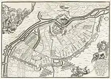 Для организации осады Август II порекомендовал Петру I генерал-лейтенанта Л. Н. Алларта, специалиста в инженерном деле, однако Пётр был «недоволен его медлительностью» и лично взял на себя руководство осадными работами. Осаждающие установили вокруг Нарвы и Ивангорода артиллерийские орудия, а также построили укрепления на случай подхода дополнительных сил шведов с запада. Воспользовавшись тем, что река Нарова у Ивангорода и Нарвы делает изгиб, русские войска построили в двух верстах (ок. 2 км) к западу от Нарвы вокруг своего лагеря линию обороны, состоящую из двойного земляного вала. Обе оконечности вала — и северная, и южная — упирались в реку, и русская армия, занимавшая позиции у Нарвы, была защищена валами и с запада, и со стороны Нарвы. Общая протяжённость вала составляла 7 вёрст (7.5 км)[18][30]. (см. ниже «план битвы при Нарве»)