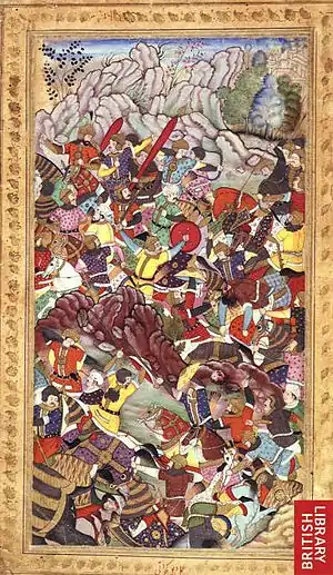 ![]() Битва при Панипате. Иллюстрация из перевода «Бабур-наме» на персидский язык (около 1590) | |||