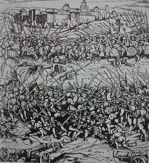 В это время головной отряд ландскнехтов приблизился к позициям испанцев и решительно атаковал противника[22]. Якоб Эмпсер и его лейтенант Фабиан фон Шлабендорф оба были убиты во время этой стремительной атаки, однако основным силам ландскнехтов удалось пробиться в лагерь и навязать бой испанской пехоте, которая уже поджидала противника, готовая к бою. Пики в бою против коротких мечей испанцев сыграли с ландскнехтами злую шутку: испанцы легко прорвали стройные ряды противника, тогда как длинные громоздкие пики ландскнехтов не могли причинить испанской пехоте большого вреда. Ландскнехты вынуждены были отступить, потеряв в бою более тысячи человек.