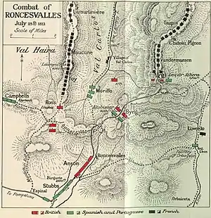 ![]() Карта битвы при Ронсевале. Она скопирована из работы сэра Чарльза Омана «История Пиренейской войны: том VI», которая была первоначально опубликована в 1922 году. | |||