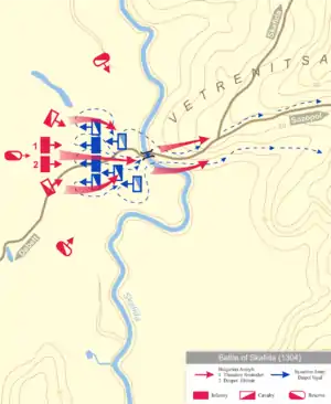 Две армии встретились недалеко от Созополя, у реки Скафида. После первых столкновении болгары отступили, и византийцы во главе с деспотом Войсилом, братом Смилеца, бросились в погоню, но мост через реку рухнул под ними. Это вызвало панику среди греков. Болгары контратаковали и разгромили их. Многие византийцих были убиты, другие утонули в реке. Летописец Георгий Пахимер предполагал, что обрушение моста было несчастным случаем[3]. Современные болгарские историки считают, что разрушение моста было ловушкой, устроенной болгарами.