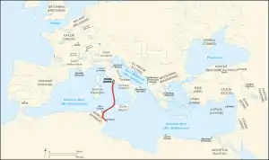 ![]() Путь войск Цезаря от Рима до Тапса | |||