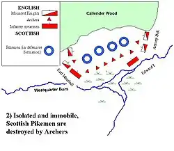 Английские рыцари прорываются через шотландских рыцарей и лучников, но останавливаются пикинерами.