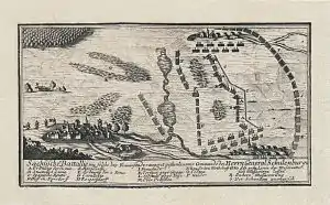 На левом фланге находились: 7 рейтарских, 4 драгунских роты и 2 пехотных батальона[11].