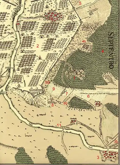 Густав Адольф искал теперь победы на левом фланге. Граница собственно лагеря Валленштейна шла вдоль Зонненштрассе (Цирндорф), восточнее подъездной дороги выступая к северу. Перед ней лежала по линии Фуггерштрассе передняя линия обороны, а в месте их схождения — оснащенный артиллерией звездообразный шанец.