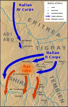 II корпус двинулся на юг от Аксума, преследуя отступающего Рас Имру. В то же время IV корпус двинулся на юг от эритрейской границы к левому флангу отряда Раса Имру. Земля, пройденная обеими силами, была очень грубой и очень негостеприимной, с небольшим количеством дорог. В какой-то момент II корпус был неожиданно атакован, в то время как его части были натянуты вдоль одной дороги. Они были вынуждены сражаться старомодным построением Каре, так что эфиопы отступили только после использования тяжёлой артиллерии и Королевских ВВС Италии (Regia Aeronautica Italia). После этого итальянцы заняли оборонительные позиции, что вызвало раздражение у Бадольо[5].