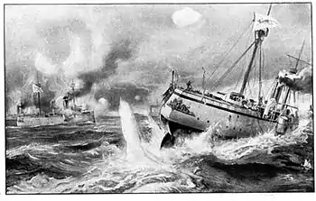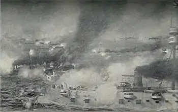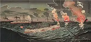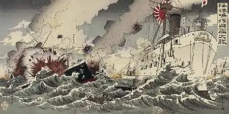 ![]() Битва при Ялу. Японская пропагандистская гравюра. Художник Кобаяси Киётика. 1894. | |||