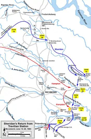 Рейд начался 7 июня, но через четыре дня близ станции Тревильян Шеридана нагнали две кавалерийские дивизии южан под командованием генерал-майоров Уэйда Хемптона и Фицхью Ли (племянника самого Роберта Ли). В ходе двухдневной отчаянной схватки мятежникам удалось оттеснить северян от железной дороги и полностью сорвать их попытку соединиться с Хантером. Шеридан был вынужден ввернуться в расположение армии Гранта. В то же время сражение сковало значительные силы кавалерии Конфедерации, а значит, во многом оставило Ли без кавалерийской разведки. Поэтому генералу Гранту действительно удалось скрытно переправить Потомакскую армию через Джеймс и неожиданно появиться прямо под Питерсбергом.