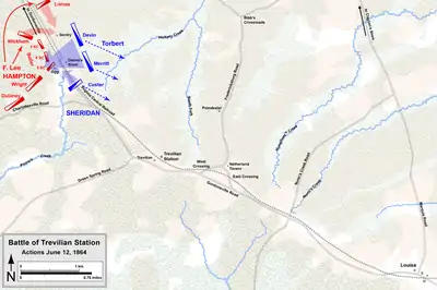 Рано утром 11 июня бойцы Хемптона атаковали части дивизии Альфреда Торберта и после ожесточённого боя, во время которого кавалеристам пришлось спешиться, отбросили их на север, ближе к Клейтону. Он и его солдаты и офицеры ждали, что удар с правого фланга произойдёт с минуты на минуту. Но в это время Фицхью Ли, двигавшийся несколькими милями восточнее по дороге от Луизы, встретился с бригадой генерала Кастера. Начался бой, после которого «джонни» отступили обратно к Луизе. Воспользовавшись этим, Кастер по открывшейся вдруг дороге вдоль ручья Нанса ринулся прямо к Тревильяну, где захватил обоз Хемптона, в том числе 800 лошадей.