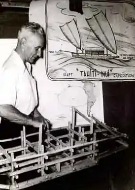 В 1956 году Эрик де Бишоп принялся за строительство своего нового судна — бамбукового плота. Он собирался проплыть на нём от острова Таити до побережья Южной Америки, спустившись до 40° ю. ш. Таким образом Эрик хотел опровергнуть теорию Тура Хейердала о заселении Полинезии с запада и доказать, что между народами существовал культурный обмен, но именно полинезийцы достигали берегов Южной Америки, а не наоборот. Вскоре определился экипаж плота. В него вошли: друг Эрика, Фрэнсис Коуэн, молодой француз Мишель Брэн (Мишель в это время готовился к свадьбе, и Эрик боялся, что он изменит своё решение, но невеста уговорила его участвовать). Также в команду вошли брат Мишеля Ален и чилиец Хуанито. В Папеэте у экспедиции был свой связист, Ролан д'Ассинье (ФО-8-АД)), раздражавший путешественников перекличками и неверными прогнозами. Плот был назван «Таити-Нуи» (великий остров Таити). Отплытие состоялось 8 ноября 1956 года. Местные жители подарили путешественникам кур, трёх котят-талисманов и свинью. Плавание началось удачно, только перед островом Пасхи пришлось сделать крюк. Вскоре ситуация изменилась: 9 мая 1957 года разразился очень сильный шторм. Позднее выяснилось, что шторм подобной силы бывает раз в 50 лет. Команде удалось справиться с бурей, но тяжёлой ценой: были сильно повреждены палуба и остов плота. «Таити-Нуи» мог продолжать плавание, но нового шторма он бы не выдержал. Эрик де Бишоп решил не рисковать и попросить отбуксировать плот до архипелага Хуан - Фернандес для ремонта. Отправленный радиосигнал о помощи был пойман радиолюбителем. На следующий день путешественники с удивлением узнали, что «Таити-Нуи» разбит и на борту трое раненых, кроме того, были даны неправильные координаты. Экипажу удалось связаться с другим радиолюбителем и уточнить координаты. Вскоре к плоту подошло чилийское судно «Бакедано» и взяло «Таити-Нуи» на буксир. Однако из-за высокой скорости, которую не мог выдержать плот, произошёл ряд осложнений. В результате он дважды врезался в корабль. После второго столкновения плот окончательно разбился, и было принято решение покинуть «Таити-Нуи»[11][12].