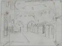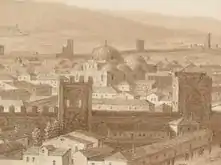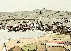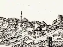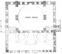 ![]() Предположительный оригинальный передний фасад мечети. При реконструкции облика здания Вильям Гесте (Уильям Хейсти, Вильям Эсти) не изобразил второй минарет. 1798 год | |