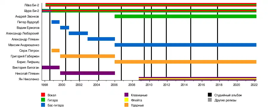 Би-2 — белорусская и российская рок-группа, образованная в 1988 году в Бобруйске. Основатели и бессменные участники — Шура Би-2 (гитара, вокал) и Лёва Би-2 (основной вокал). В состав команды в 2021 году также входят Андрей Звонков (гитара), Макс Лакмус (бас-гитара), Борис Лифшиц (ударные, перкуссия) и Ян Николенко (бэк-вокал, клавишные, флейта, перкуссия).