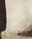 Пейзаж на заднем плане: отчётливо виден порт, корабли, вершины гор