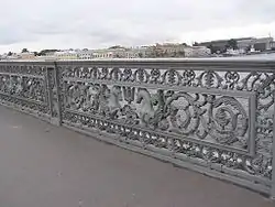 Перильное ограждение является наиболее интересной и художественно исполненной частью декора моста. По оценке М. С. Бунина, художественные достоинства и чистота рисунка звеньев ограды позволяют считать их лучшими произведениями подобных элементов[66]. Большинство источников автором перильного ограждения называют архитектора А. П. Брюллова[68][158][51][4]. Историк искусства В. Я. Курбатов приписывал авторство О. Монферрану[81][76]. В. А. Черненко на основании архивных данных установил, что Брюллов принимал участие только в первоначальной разработке рисунка перил моста, окончательный вариант перильного ограждения выполнил архитектор Н. Е. Ефимов[159]. Перила были изготовлены на заводе Берда[160]. Поскольку мост пересёк Неву неподалеку от выхода в залив, в композицию его перил решено было ввести аллегории морской стихии[59]. В каждой секции изображён трезубец, к которому обращены с двух сторон фантастические морские коньки, задние части которых в виде завитых рыбьих хвостов вплетены в симметричный растительный фигурный орнамент[161].