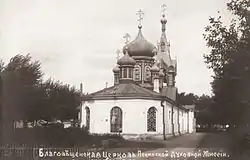 В 1903 году на строительство подворья Пекинской духовной миссии было отпущено безвозмездно с местной лесопилки дерево. Строительным комитетом руководил князь С. Н. Хилков, инициаторами строительства были чаеторговец И. Ф. Чистяков (1857—1922), А. Г. Бороздин и др. Строители, не осведомлённые в церковном строительстве, ориентировали её в южную сторону, а не на восток[2]. Выстроенный храм Благовещения Пресвятой Богородицы погиб во время пожара, произошедшего 10 февраля 1918 года. По воспоминаниям священника Николая Падерина: «Пожар в старом Благовещенском храме был настолько силён, что железные и другие металлические предметы и детали расплавились, вся церковная утварь сгорела, стены изнутри рухнули, а снаружи кирпич местами развалился. Целиком устояла только южная алтарная стена, где под стеклом невредимо стоял образ Благовещения Божией Матери. Святой образ величественно, как „нерушимая стена“ стоял среди развалин и как-то особенно торжественно выглядел над беспорядочной грудой тлевших угольев и раскаленных металлических слитков»[3].