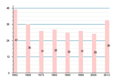 | 1962 | 1968 | 1975 | 1982 | 1990 | 1999 | 2006 | 2008 | 2011 | 2012 | 2013 |