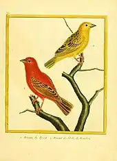 Лист 1765 года, на котором изображена Foudia bruante (внизу), которая, однако, может представлять из себя цветовую морфу красного фуди
