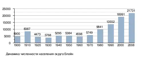 По состоянию на июль 2008 года население округа составляло 21 731 человек[10]. Округ находится на 17-м месте в штате по населению. С 2003 года численность населения увеличилась на 4,82 %[10]. Ниже приводится динамика численности населения округа[10][11][12]. Стоимость жизни в Блейне как популярном курорте выше, чем в окружающих его округах: например, стоимость домов в округе почти вдвое превышает среднюю цену по штату Айдахо[11]. Поэтому многие из тех, кто работает в Блейне, живут в соседних округах, в частности в Шошоне и Линкольне. Так, на 2001 год в основных городах Блейна Сан-Валли, Кетчуме и Хейли работало 1 008 не-резидентов округа[13].