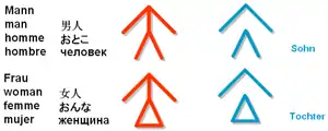 Местоимение «я» состоит из символа «человек» и цифры «1» (первое лицо). Используемая цифра «2» даст символ для слова «ты»; добавление показателя множественного числа (крестик вверху) произвело бы соответственно местоимения «мы» и «вы» (во множественном числе).