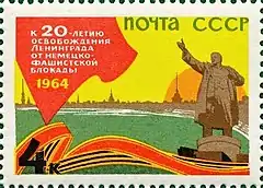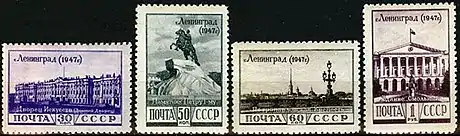 В январе 1948 года была выпущена серия марок «Виды Ленинграда», посвященная 4-й годовщине освобождения от фашистской блокады. На марках указан 1947 год. Миниатюры представляли историю города: Медный всадник, Зимний дворец, Петропавловская крепость, здание Смольного, к истории блокады и битве за город эти виды отношения не имеют[50].
