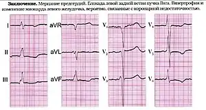 На ЭКГ образуются зубцы Q в отведениях I, aVL и r в отведениях III, aVF. Высокий зубец R в отведениях I, aVL и глубокий S в отведениях III, aVF. Отклонение ЭОС влево более 30 градусов. Кроме того определяется уширение комплекса QRS на 0,01 — 0,02 сек. по сравнению с шириной до блокады (в большинстве случаев не приводит к уширению выше верхней границы нормы).